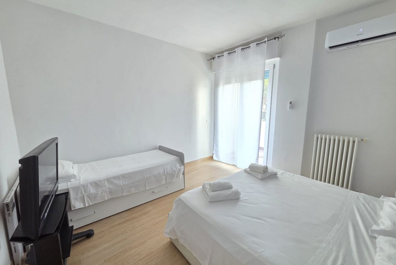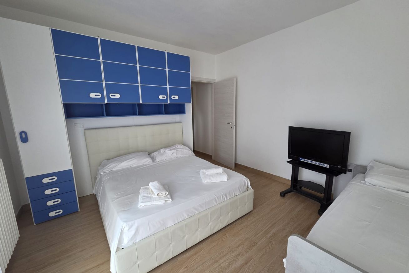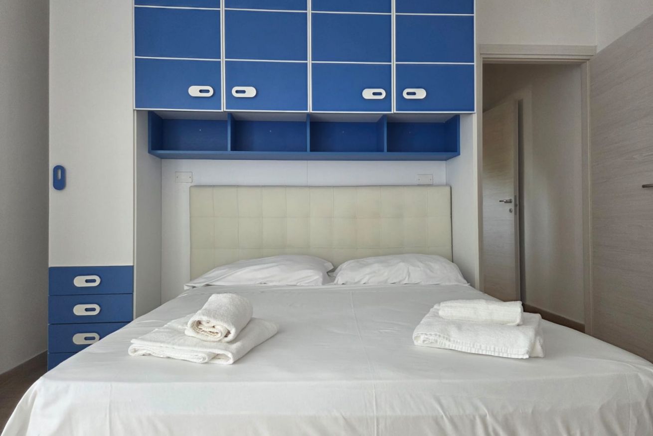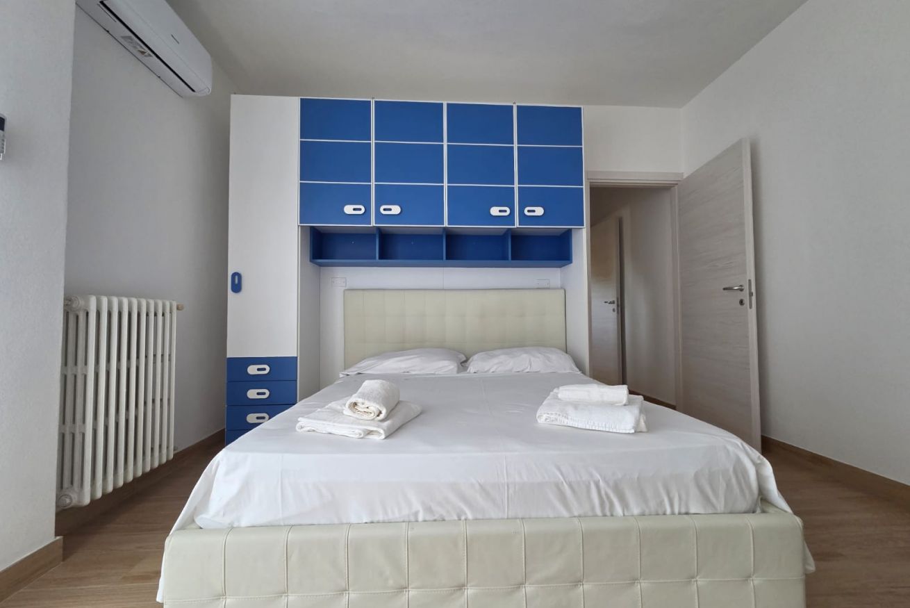Il nostro bilocale è dotato di: terrazzo, aria condizionata, riscaldamento, finestre e saracinesche con aperture elettriche, tv a schermo piatto, armadio, cassettiera, tende oscuranti, prodotti per la pulizia, stendibiancheria e pavimento in gres.