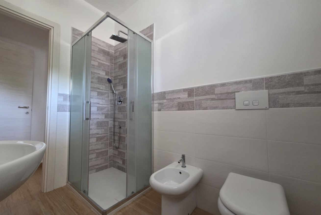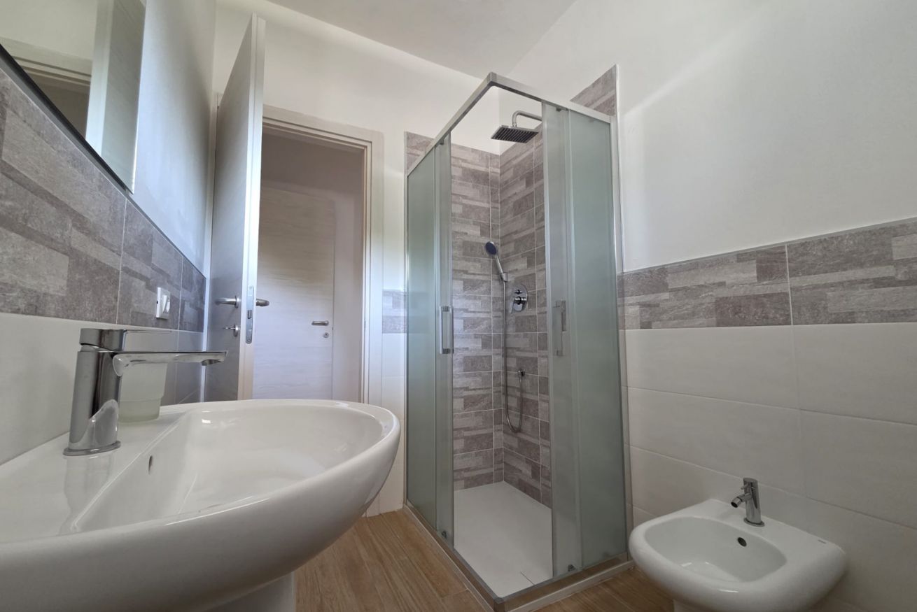 Nella zona notte troviamo una camera con letto matrimoniale e un letto singolo con porta finestra che porta al nostro terrazzo con vista panoramica, bagno privato finestrato e completo con cabina doccia.